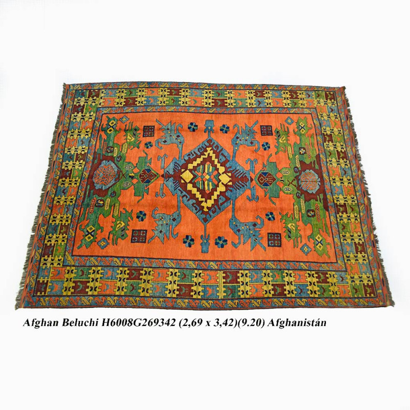 Alfombra elaborada a mano con lana de excelente calidad. Tiene unas dimensiones de 269X342 cm mas el fleco que sale de la misma trama de la alfombra.