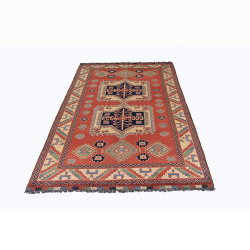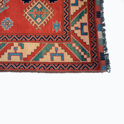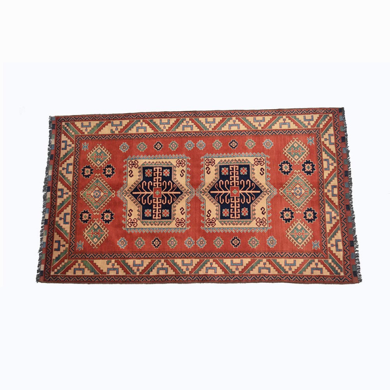 Alfombra elaborada a mano con lana de excelente calidad. Tiene unas dimensiones de 126 X 208 cm mas el fleco que sale de la misma trama de la alfombra, dando una medida real de 126 X 220cm.
