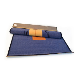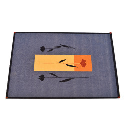 Alfombra acrílica con diseño moderno, en tonos  oros y azules.