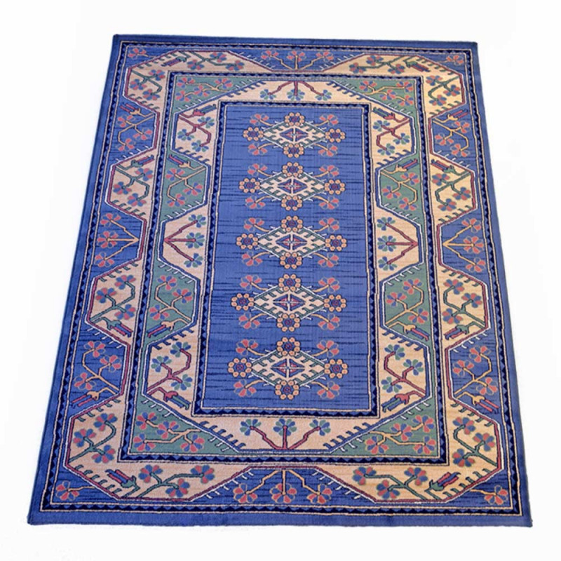 Alfombra acrílica con original diseño geométrico, en tonos azules.