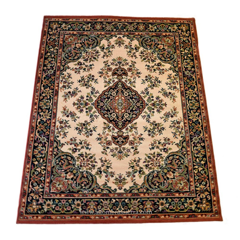 Alfombra acrílica con diseño clásico, floral con centro, disponible  en tres colores, salmón, teja y verde.