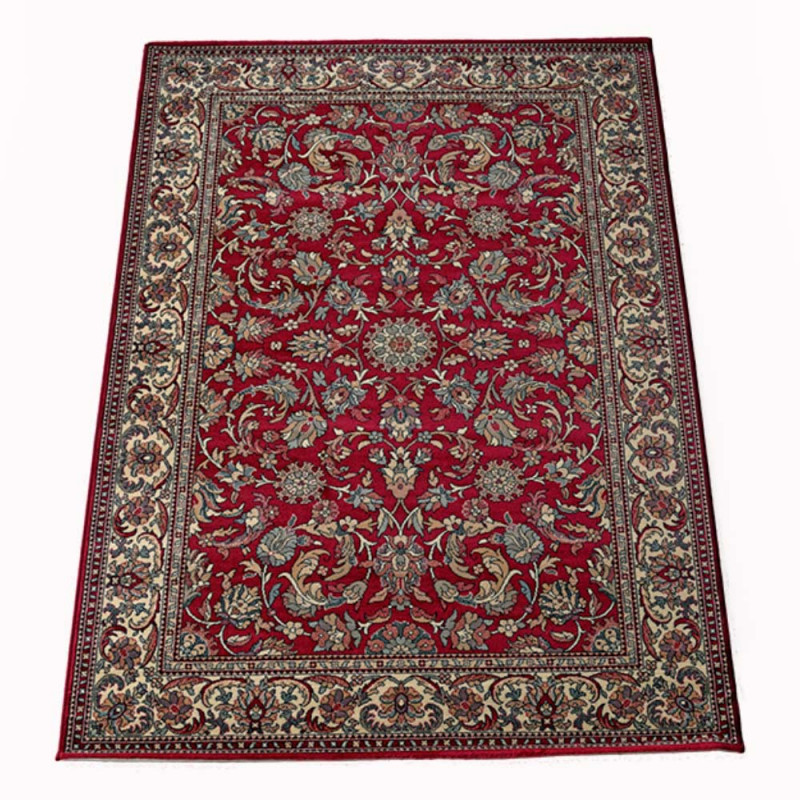 Elegante alfombra clásica, de composición acrílica. Disponible en dos colores, rojo y azúl grisáceo, y multitud de medidas.