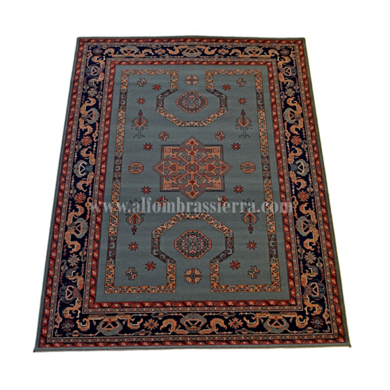 Elegante alfombra clásica, de composición acrílica. Disponible en dos colores, rojo y azúl grisáceo, y multitud de medidas.