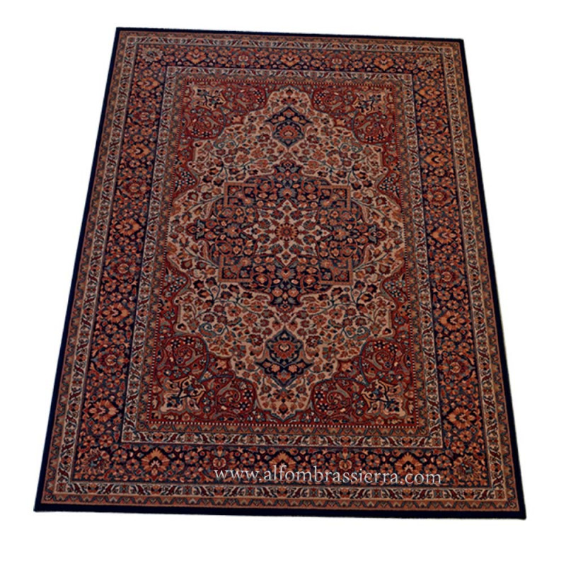 Alfombra de pura lana virgen, hecha en Bélgica, con un diseño clásico y elegante. Posee un dibujo floral que la hace muy sufrida. Disponible en dos colores; teja y azul marino.