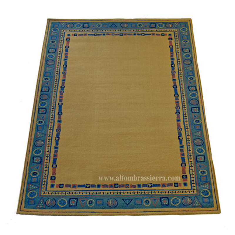 Alfombra de sala o habitación, hecha a máquina con lana de alta calidad. De estilo moderno y con alegres colores amarillos.