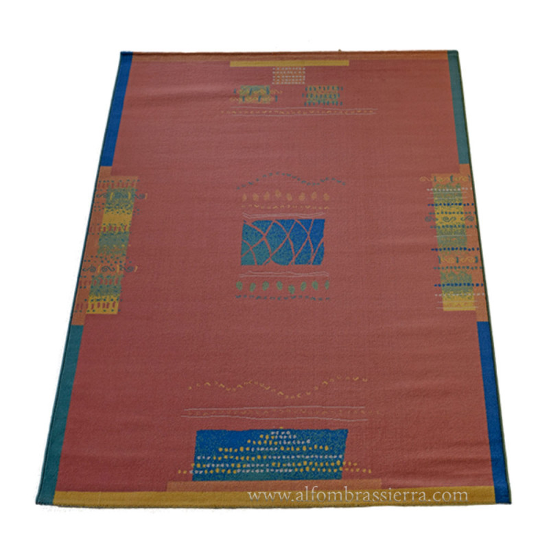 Alfombra de sala o habitación, hecha a máquina con lana de alta calidad. De estilo moderno y con alegres tonos salmones.