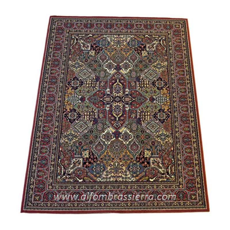 Elegante alfombra clásica, de composición acrílica. Disponible en dos colores, rojo y azúl grisáceo, y multitud de medidas.