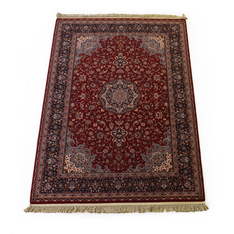 Elegante alfombra clásica, de composición acrílica. Disponible en dos colores, rojo y azúl grisáceo, y multitud de medidas.