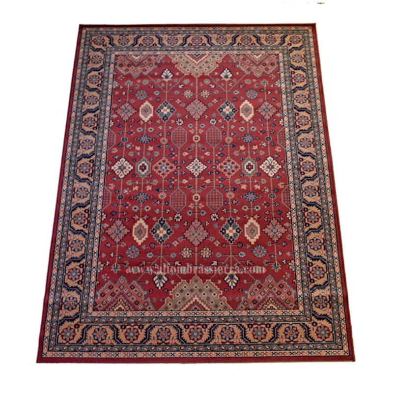 Elegante alfombra clásica, de composición acrílica. Disponible en dos colores, rojo y azúl grisáceo, y multitud de medidas.