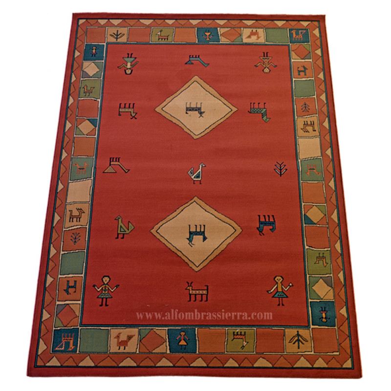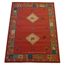 Elegante alfombra clásica, de composición acrílica. Disponible en dos colores, rojo y azúl grisáceo, y multitud de medidas.