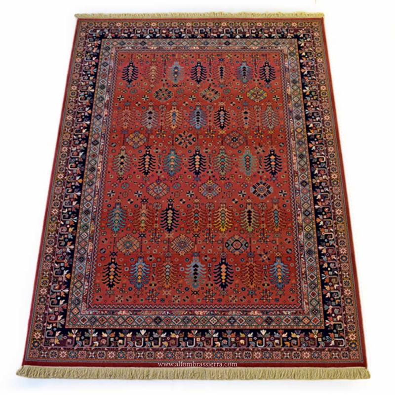 Elegante alfombra clásica, de composición acrílica. Disponible en dos colores, rojo y azúl grisáceo, y multitud de medidas.
