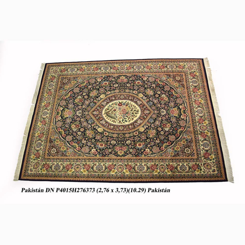 Alfombra hecha en Pakistán, a mano, una de las mejores calidades que se pueden encontrar en alfombras anudadas a mano. Elaborada con lanas finísimas y de colores brillantes. Con diseño clásico y elegante ideal para cualquier estancia de su casa, ya sea en un comedor,  un salón o en un despacho.