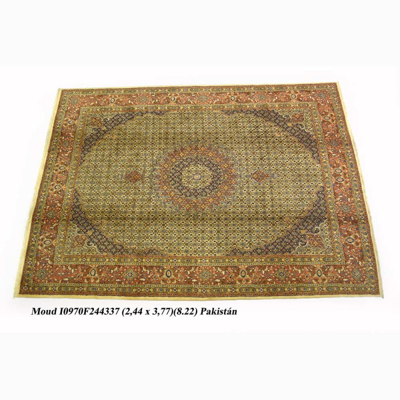Alfombra Moud, hecha a mano en Irán, de lana. Medida total 244X337 mas flecos
