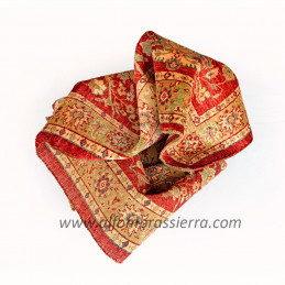 Elegante alfombra clásica, de composición acrílica. Disponible en dos colores, rojo y azúl grisáceo, y multitud de medidas.